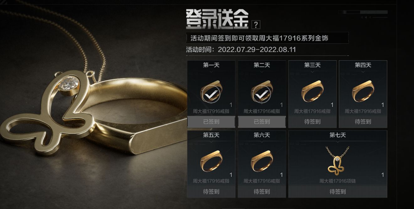 【活动规则】活动期间登录游戏,在签到活动页面签到即可领取游戏道具——周大福17916系列金戒指。累计签到七天可领取游戏道具——周大福17916金项链。