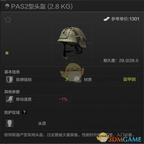 28耐久,头顶防护,高贵的装甲钢材质,比起前两个二级头更推荐PAS2,因为这头盔在市场买可能很便宜。