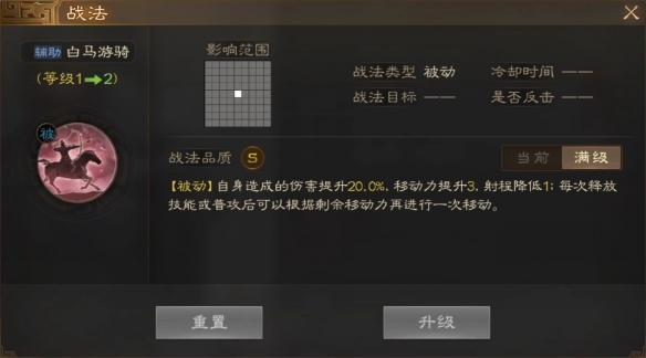 [被动]自身造成的伤害提升20.0%。移动力提升3.射程降低1:每次释放技能或普攻后可以根据剩余移动力再进行一次移动。