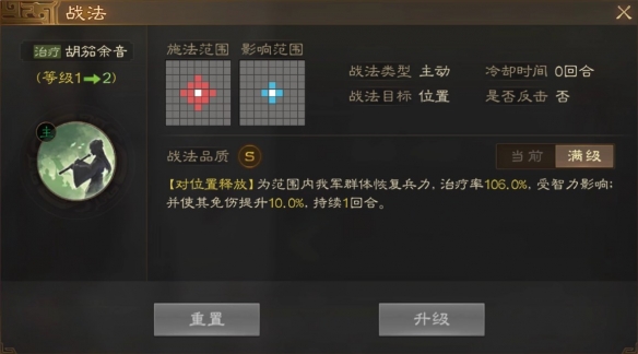 【对位置释放】为范围内我军群体恢复兵力,治疗率106.0%,受智力影响:并使其免伤提升10.0%。持续1回合。