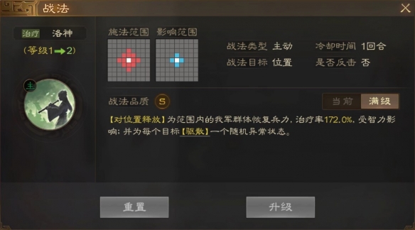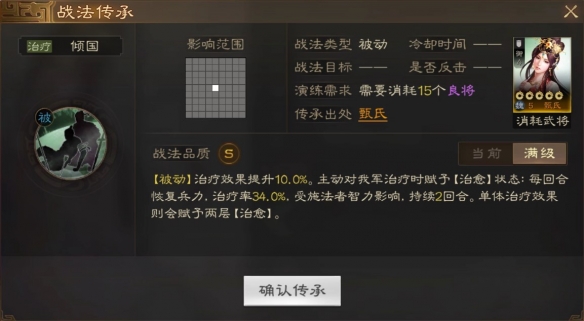[被动]治疗效果提升10.0%。主动对我军治疗时赋子[治愈]状态:每回合恢复兵力。治疗率34.0%,受施法者智力影响,持续2回合。单体治疗效果则会赋予两层[治愈]。