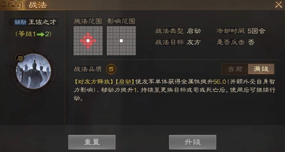 王佐 每回合使三格范围内随机友军单体全属性提升2%,持续1回合