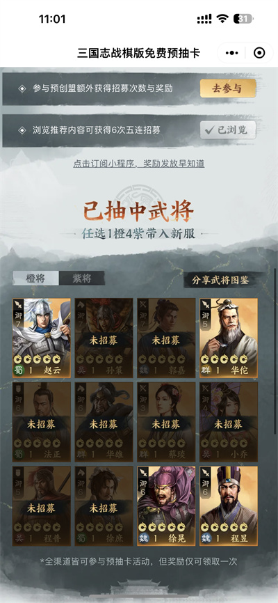三国志战棋版预抽卡选谁?怎么选?三国志战棋版游戏中开启了预抽卡的活动,可以带一个橙卡和四个紫卡进入游戏,玩家在预抽卡活动中获得的武将是可以在正式服领取的,很多小伙伴十分纠结哪些武将值得选?下面小编整理了三国志战棋版预抽卡武将推荐,希望可以帮助到大家。