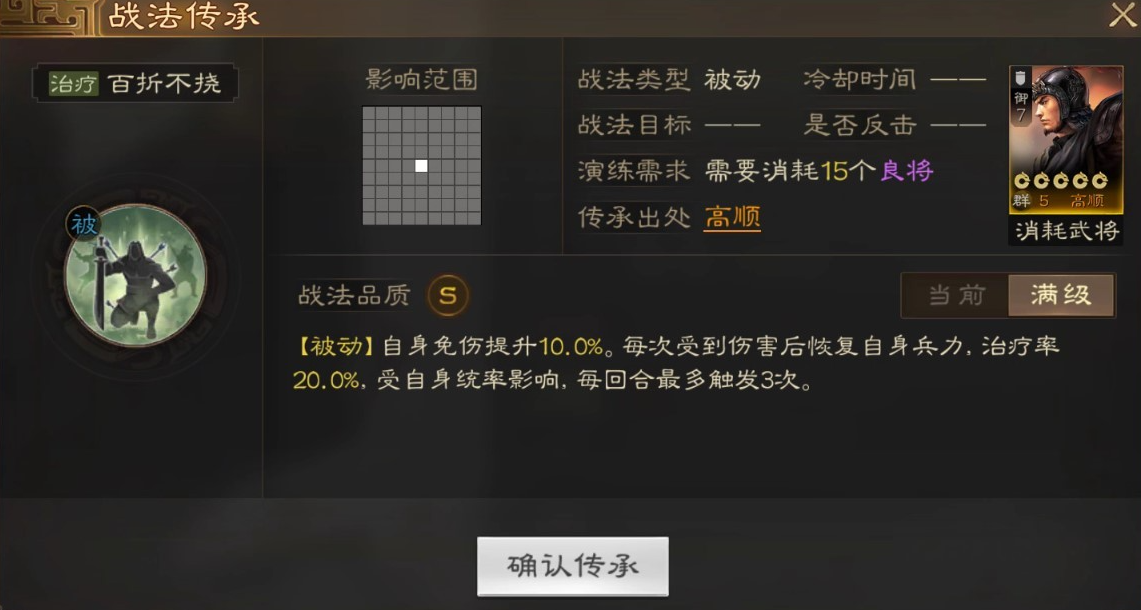 每次受到伤害后恢复自身兵力,治疗率20.0%,受自身统率影响,每回合最多触发3次。