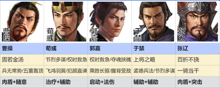 前排曹操主T带固若金汤抗住,配合于禁站中前排自带技能范围内增加统率增加团队肉度。然后后面是荀彧和郭嘉,是阵容主要法系输出。张辽单点击杀位自身卡强度就很高,但是需要搭配解控技能让他续上档。