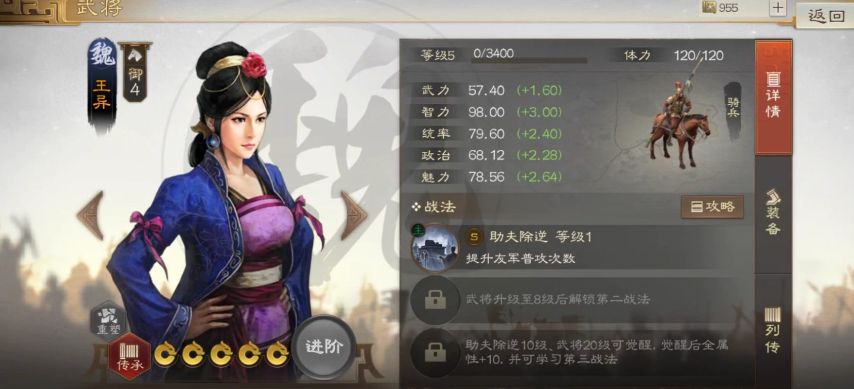 王异:魏国S1主流魏刀必选辅助,低御但增伤能力出色,自身骑兵也比较灵活。拆技【节烈多谋】洞察效果也很好用。