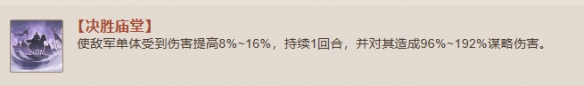 使敌军单体受到伤害提高8%~16%,持续1回合,并对其造成96%~192%谋略伤害。