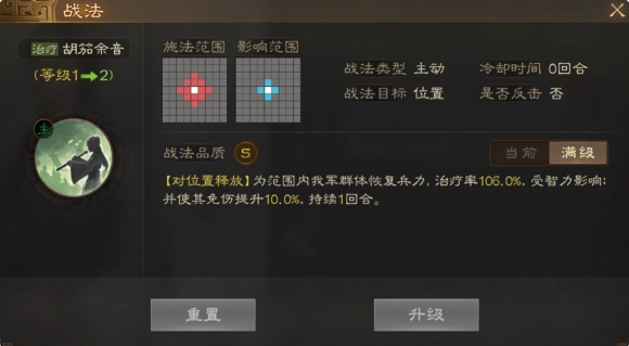 为范围内我军群体恢复兵力,治疗率50%~100%,受智力影响;并使其免伤提升5%~10%,可叠加,持续1回合。