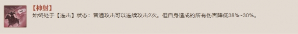 始终处于【连击】状态:普通攻击可以连续攻击2次。但自身造成的所有伤害降低38%~30%。