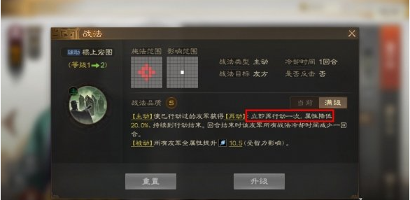 自带战法【榻上宏图】不仅可以让已行动过的友军再动一次,还能减少该友军所有战法冷却时间1回合,并使友军全属性提升。再动+冷却降低的新机制,让鲁肃搭配输出武将时,能在1回合内打出高额伤害。