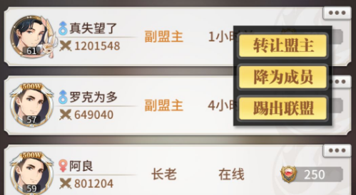 2、需要注意的是,如果角色的职位是“盟主”的话,要想退出联盟首先需要将“盟主”之位转让给其他的成员之后,才可以点击“联盟”界面中的“管理”选项,再点击“退出联盟”选项,即可退出联盟。