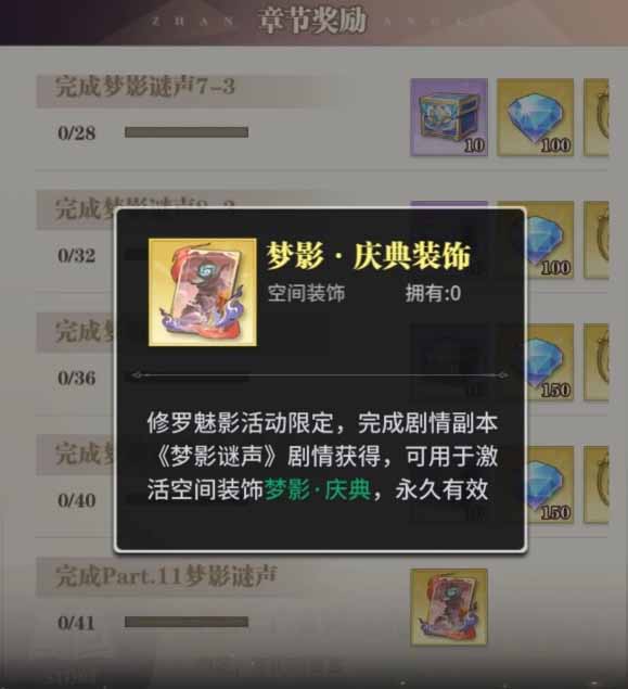 活动期间,通关剧情副本可获得「修罗密藏」、「群星之愿」、限定空间装饰「梦影●庆典」等稀有奖励。