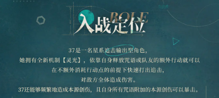 1、37是一名星系追击输出型角色,她拥有全新机制【灵光】,依靠自身释放咒语或队友的额外行动就可以在不额外消耗行动点的前提下快速打出追击,对敌方全体造成伤害。