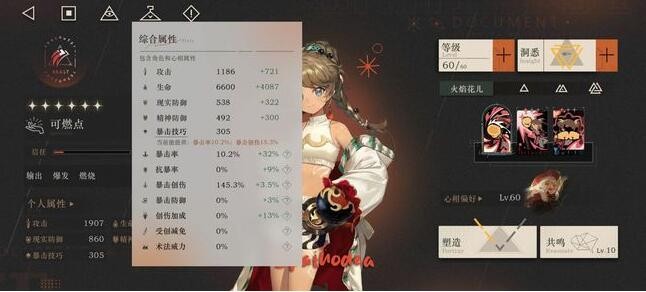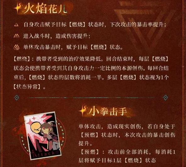 然而,她的缺点在于缺乏创伤加成和生存能力。技能组和传承组更注重双爆,共鸣核心块也较为复杂。如果不与像安安这样的创伤加成辅助角色搭配,她自身获得的创伤加成可能较低。技能组和传承组也缺乏任何生存特性,对队友提供的生存能力有较高的要求。需要特别注意,“燃烧”与“中毒”不同,“燃烧”只被视为一个异常状态,而“中毒”则是每层独立的异常状态。