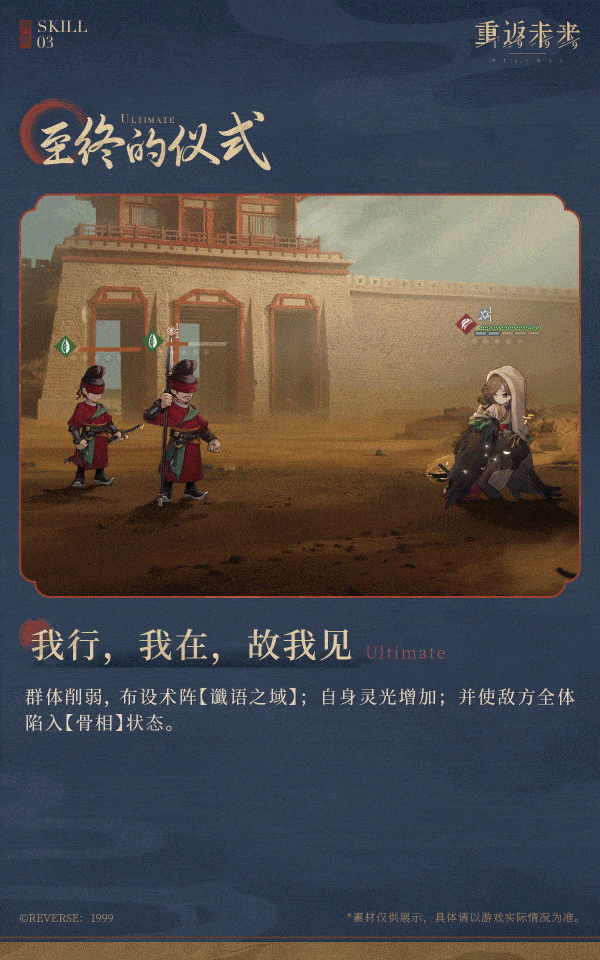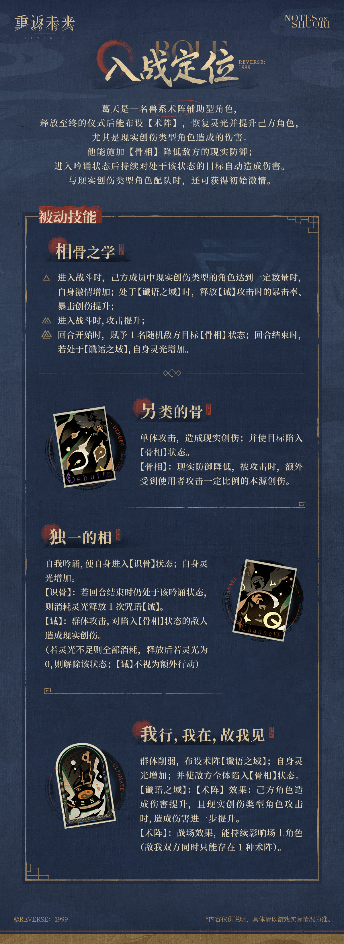 今天小编给大家带来了《重返未来:1999》葛天技能图鉴分享!葛天,本名燕来,葛天氏族,游戏《重返未来:1999》六星兽属性辅助型角色,灭蒙鸟神秘学家,沛城事件后加入圣洛夫基金会。葛天是一名兽系术阵辅助型角色,释放至终的仪式后能布设【术阵】,恢复灵光并提升己方角色,尤其是现实创伤类型角色造成的伤害。他能施加【骨相】降低敌方的现实防御;进入吟诵状态后持续对处于该状态的目标自动造成伤害。与现实创伤类型角色配队时,还可获得初始激情。