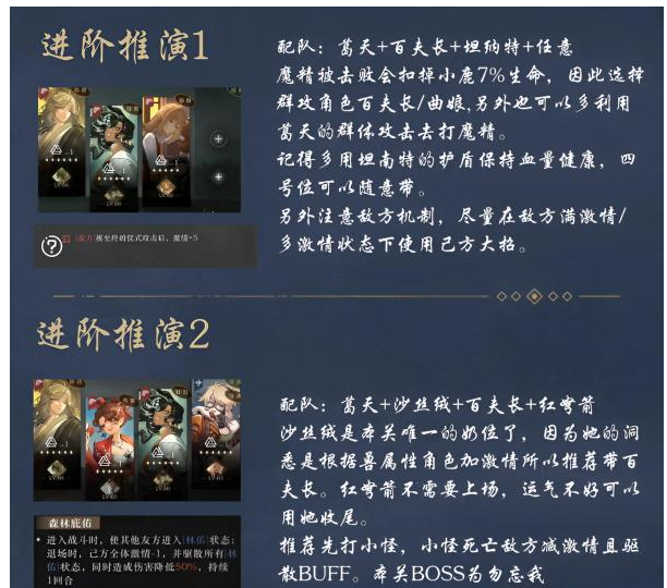 (2)沙丝绒是本关唯一的奶位了,因为她的洞悉是根据兽属性角色加激晴所以推荐带百夫长。红弩箭不需要上场,运气不好可以用她收尾。
