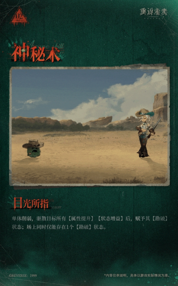 单体削弱,驱散目标所有【属性提升】【状态增益】后,赋予其【勘破】状态;