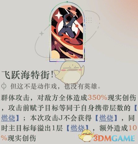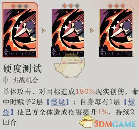 1、技能一·硬度测试:单体攻击,对目标造成270%现实创伤,命中时赋予2层[燃烧];自身每有1层[燃烧]使已方全体造成伤害提升1%,持续2回合。