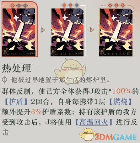 2、技能二·热处理:群体反制,使己方全体获得J攻击*100%的[护盾]2回合,自身每携带1层[燃烧]额外提升3%护盾系数;持有该护盾的我方受到攻击后,J将使用[高温回火]进行反击。