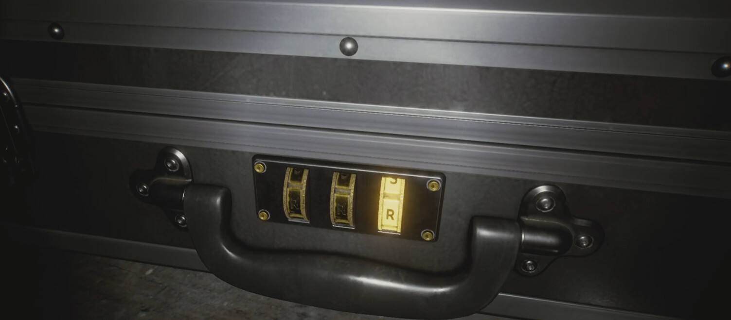 该保险箱密码是R-R-R,密码相关文件在3层的图书馆内,可以在一处书籍中找到一张关于“蕾贝卡”的照片,照片上有标注“Rising-Rookie-Rebecca”