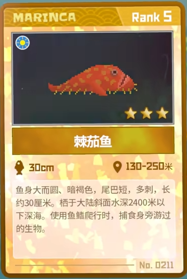 捕捉方法:在水深130-250处可以遇到棘茄鱼,使用网枪或消音飞镖就能捕捉到。