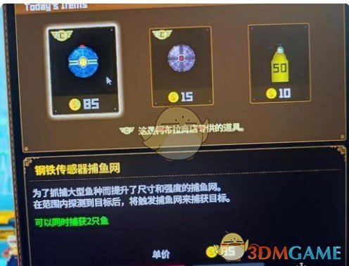 1、钢铁传感器捕鱼网是柯布拉上商店专供的道具,售价85金。