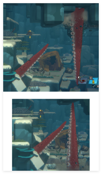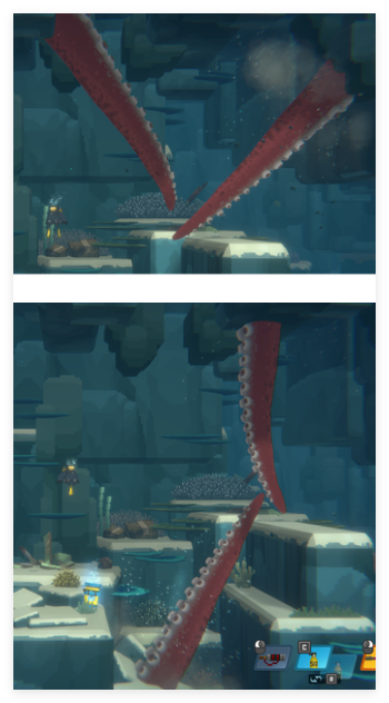 第二组触手的攻击点靠前,所以是看见冒出的瞬间得准备往后游,石头这里再往过触发了就往回游,这是两组触手没有攻击的地方;