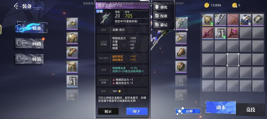 就拿下图这件武器——镇守之双剑来举例,可以看到面板上有多种属性,分别有部位介绍、主属性、强化属性、装备属性、回路属性、除此之外防具还会有防具精通以及套装属性。