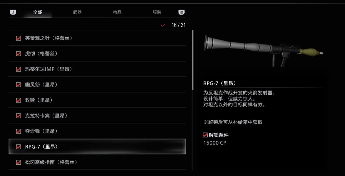 RPG是生化危机9中通关一周目后,可使用CP点解锁的强力武器,RPG-7是生化危机系列招牌的高火力武器。大范围的高伤害杀伤力能够给予玩家极大的安全感。下面就为大家分享生化危机9中RPG-7武器的解锁获取方法。