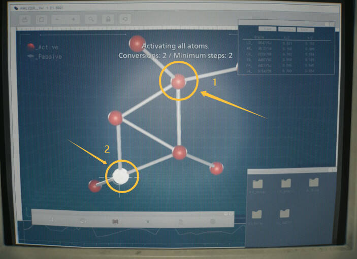 如下图,先点击上方的中间原子,第二步,点击下方中间的原子。