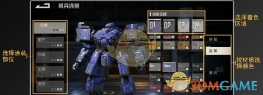 在涂装界面中,玩家可以对机兵和武器的各个部位进行涂装或是贴附机兵徽记,还能直接套用已保存的方案或使用机兵的出厂配色。