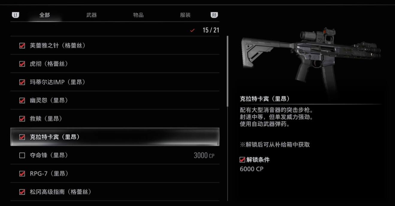 克拉特卡宾是生化危机9中通关一周目后,可使用CP点解锁的武器之一,克拉特卡宾是一把使用自动武器弹药的步枪,该武器没有可改装的选项,下面就为大家分享生化危机9中克拉特卡宾武器的介绍一览。