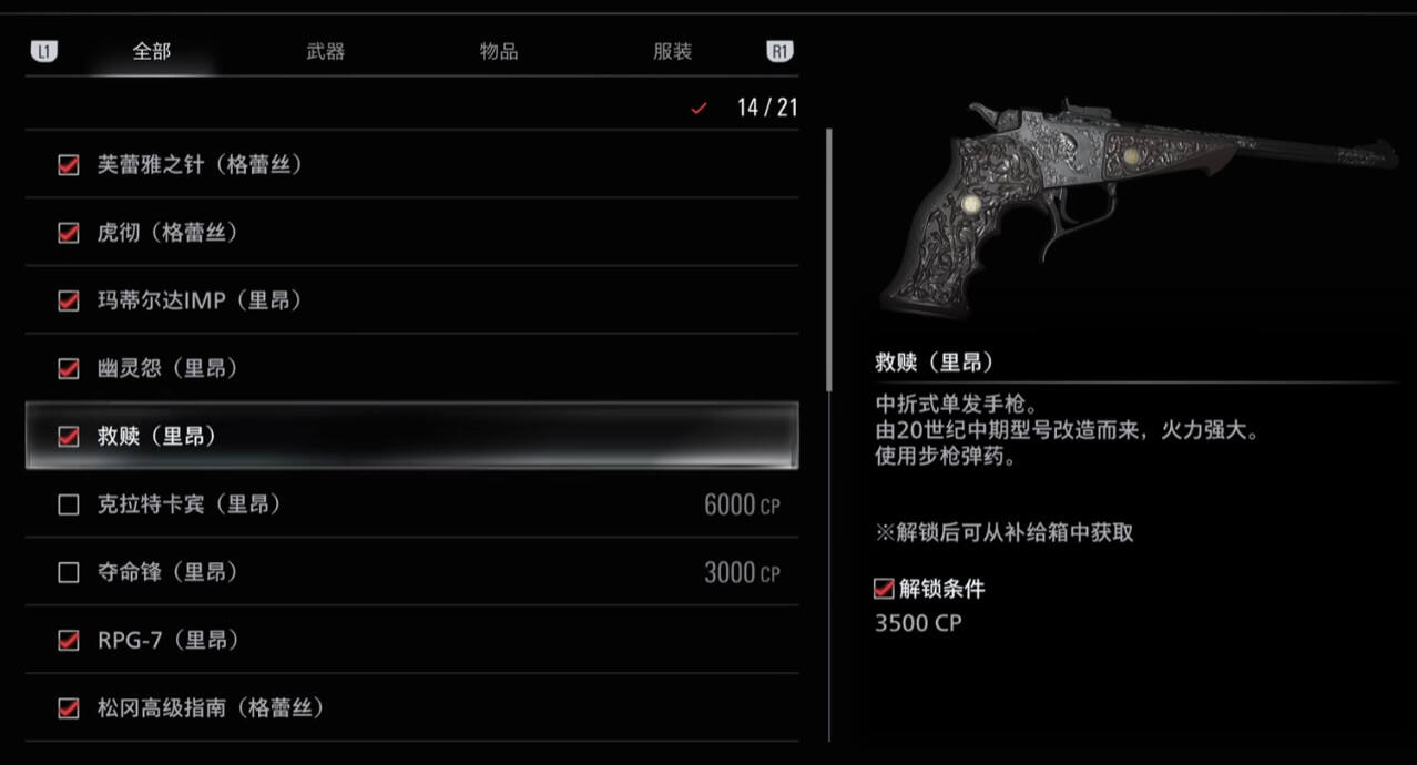 救赎是生化危机9中通关一周目后,可使用CP点解锁的武器之一,救赎是一把使用步枪弹药的手枪,极高的威力能够以及必杀大部分敌人,是游戏中里昂可使用的强力武器之一。下面就为大家分享生化危机9中救赎武器的解锁获取方法。