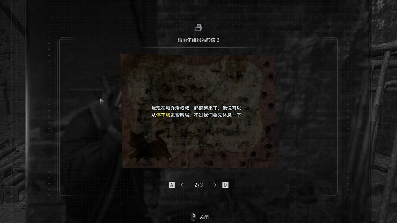 第三封“梅丽尔给妈妈的信”被放置在浣熊市中心肯多枪械店后方的一辆废弃汽车内。这是五封信中位置最为隐蔽的一封,且与主线剧情节点紧密相关。