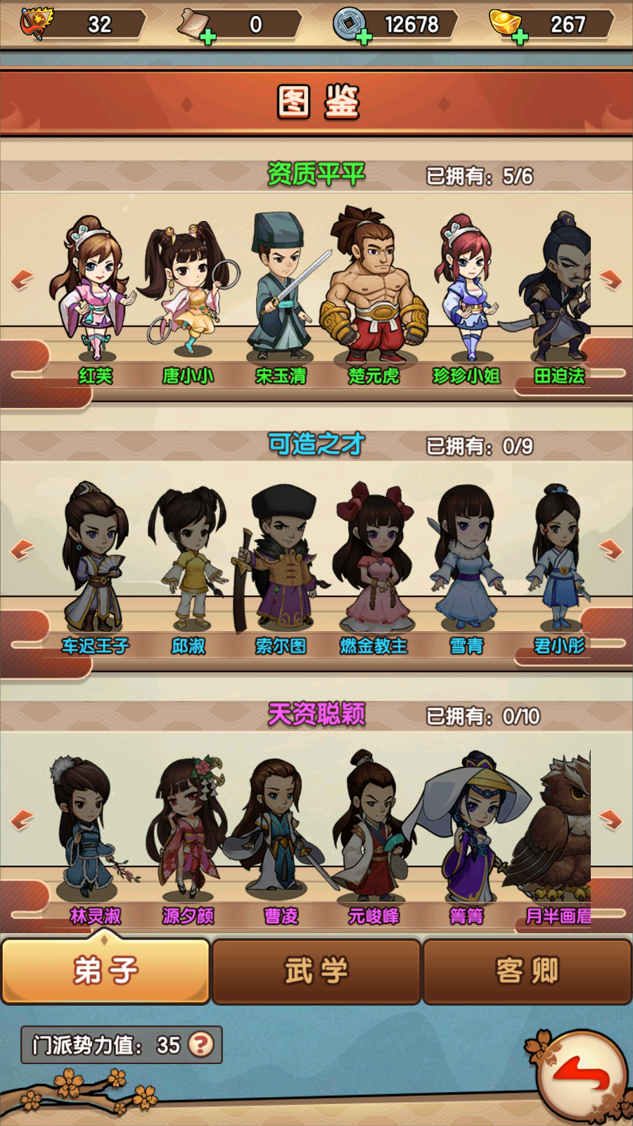 (2)背包:获得的资源存放处。 (3)图鉴:可查看弟子、武学、客卿的获取方式以及基本信息。