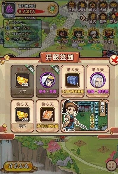 3、参与游戏中的开服签到活动,连续签到可以获得元宝、秘籍以及宝箱