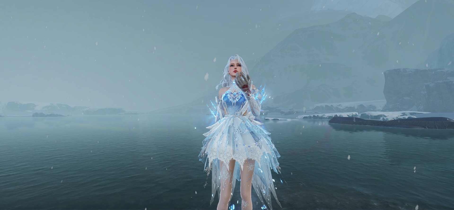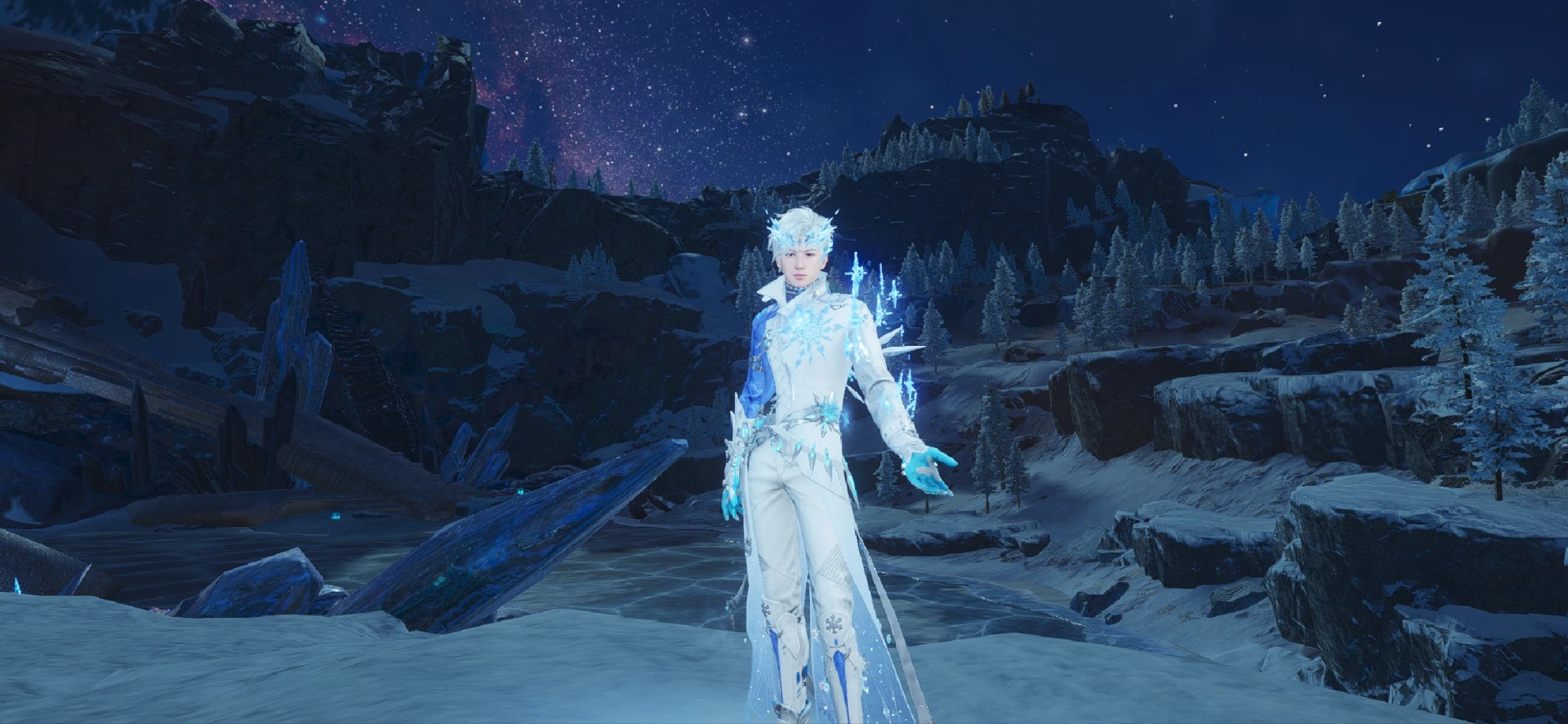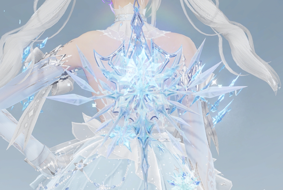 男款上装采用蓝白拼色设计,彰显冷冽与优雅的双重气质。胸口点缀精致的冰晶装饰,宛如冬日寒霜凝聚出的艺术品,下摆轻柔的白纱融入雪花图案,随步伐微微摆动带起一阵寒冬的微风。额前的冰晶发饰更是点睛之笔。