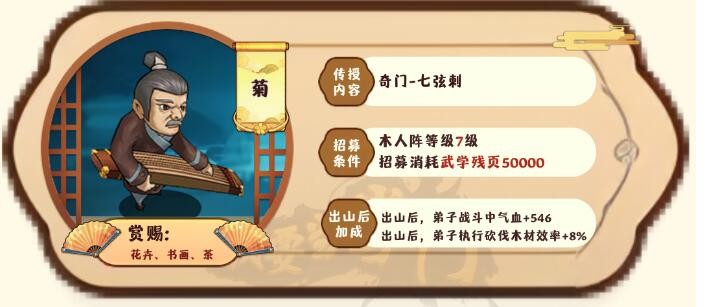 我要当掌门是一款国风武侠题材的游戏,在游戏中玩家扮演一名门派掌门人打理自己的门派!游戏中大家可以招揽客卿,江湖名宿成名已久,他们或身怀旷世武学、或知晓神兵锻方、或精通绝世阵法,将其纳入门下,一切隐秘即可为我所用!今天给大家带来了《我要当掌门》客卿菊图鉴介绍,一起看看吧!