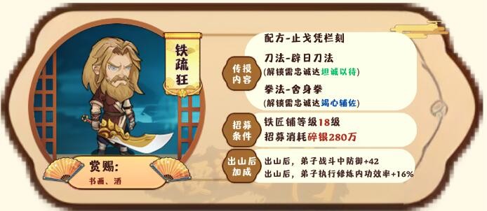 以上就是小编整理带来的《我要当掌门》客卿铁疏狂图鉴分享,更多精彩内容,请点击关注手游网!