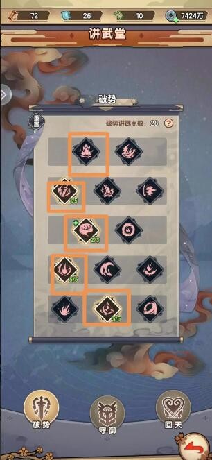 首先说下讲武堂基础知识:讲武堂分为攻击、防御、治疗3系对应的分别是破势、御守、回天,所加的属性对所有弟子生效。每个系别分为五层,其中第一、二、四层每层有3个技能,这3层技能最高可升到5级,;三层(技能最高升3级)和五层(最高升1级)里面有2个技能,每层只能选择一个技能学习,点错了也没关系花100元宝重置返还全部材料就可以。