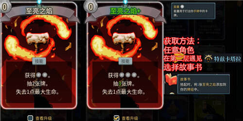 最后,击败特兹卡塔拉后,在奖励选项中选择"故事书"(Storybook)。故事书的效果是"拾起时,将1张至亮之焰加入你的牌组"。这是目前游戏中至亮之焰的唯一稳定获取途径。