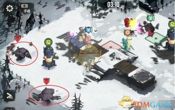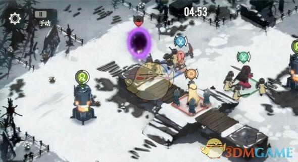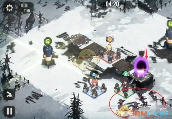 下方同时出现传送阵和一队6只小兵,此时我们要做的是用一队斗士吸引小兵的仇恨,然后另外两队尽快将传送阵打掉后回头输出小兵。此时不要节省技能,有什么放什么,防止我们掉太多状态