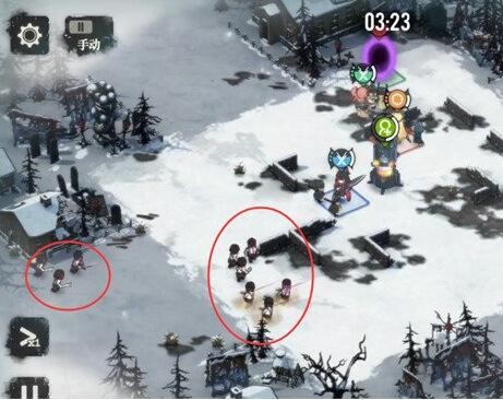 按照一二的顺序打掉黑洞,同时在左下角会出现两队一共9只小兵,数量非常多,我们一定要用一队斗士吸引住仇恨,然后另一队斗士和射手在后方进行输出,同时这一波也是本章的最后一波小兵,只要把仇恨拉住不让小兵攻击基地,那么这关也就顺利通过了