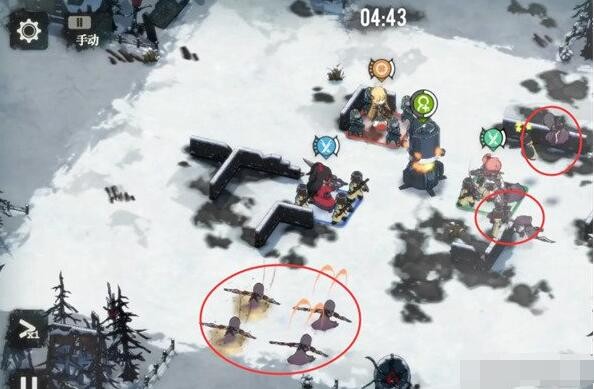 在右方会出现两队2只的小兵,而下方则出现一队4只的小兵,此时我们需要让射手和一队斗士迅速清掉右方的两队,然后包夹下方出现的4只小兵。