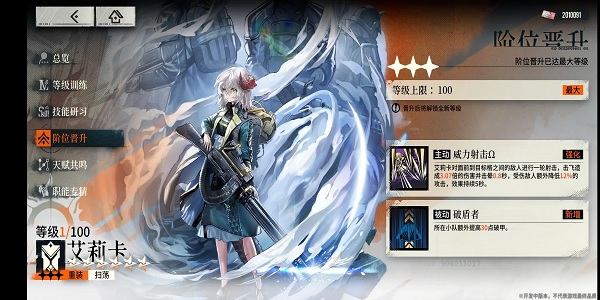 【威力射击Ω】:艾莉卡对面前到目标格之间的敌人进行一轮射击,击飞造成3.07倍的伤害并击晕0.8秒,受伤敌人额外降低12%的攻击,效果持续5秒。