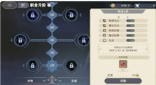 角色升阶后,达到指定的阶级,开启阶级技能选择,技能2选1,可以选择左侧技能或者右侧技能,选择技能后即可获得技能。
