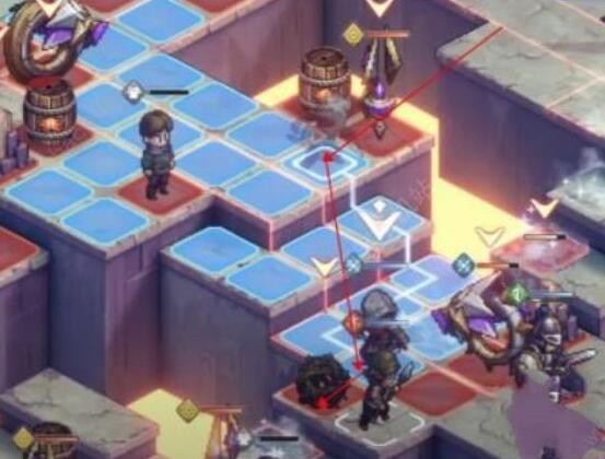 1、这关要想顺利过关得消灭对面所有敌人,同时己方没有任何单位阵亡。第一回合先用“敏捷”人去击退一下轮子,然后再用“老到”人将对面的装置钩过来,随后再次移动到下方将藤球打下去,摧毁一测的的装置