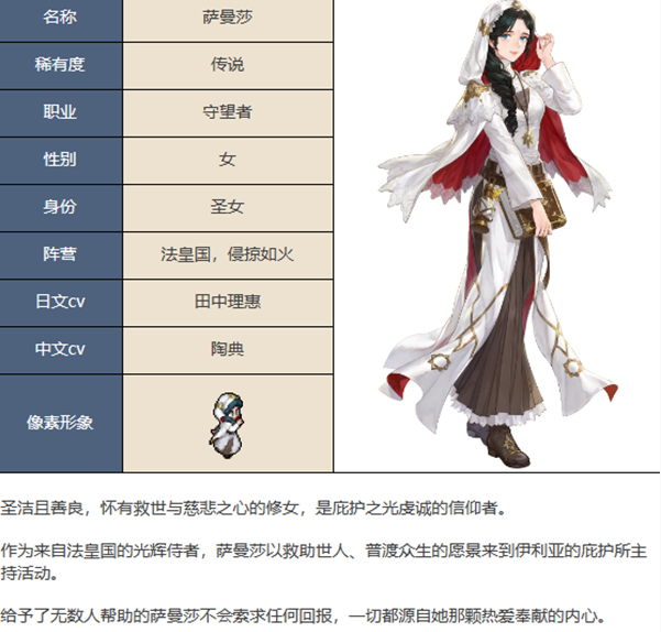 以上就是小编整理带来的《铃兰之剑为这和平的世界》萨曼莎角色介绍一览攻略,更多相关游戏攻略,请关注手游网!