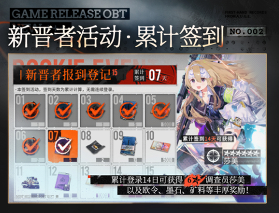 累计登录14日可获得6星调查员莎美以及欧令、墨石、矿料等丰厚奖励。