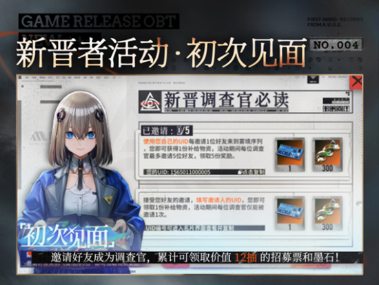 邀请好友成为调查官,累计可领取价值12抽的招募票和墨石。
